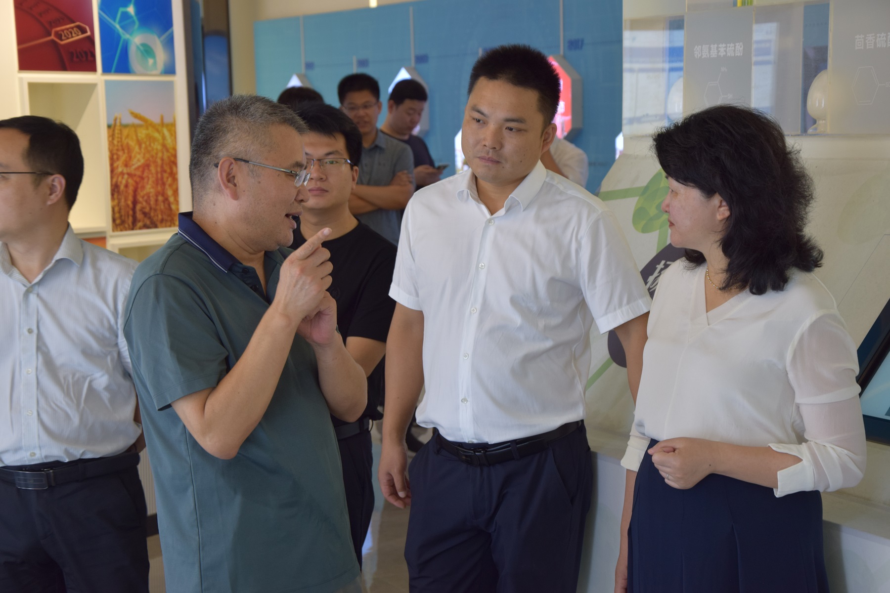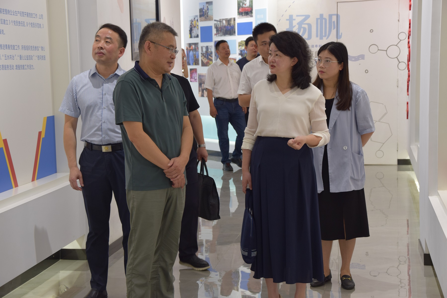 張永彬總經理陪同一行領導參觀公司文化展廳,并向其詳細介紹了揚帆新材的發展歷程,組織架構,核心產品,發明專利和歷史榮譽。