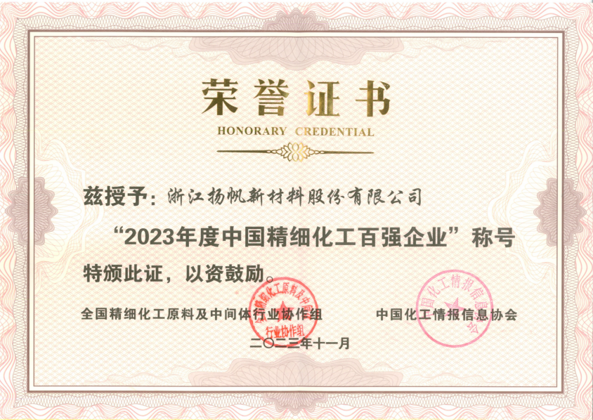 2023年度中國精細化工百強證書