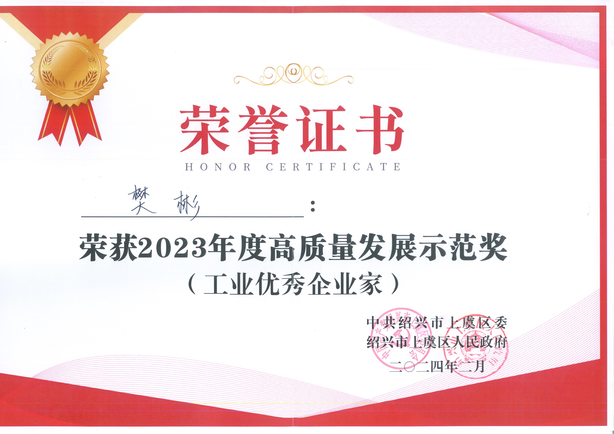 會上表彰了2023年度區級各類先進單位和個人,并對上虞區經濟發展做出卓越貢獻的企業及企業家舉行了授獎儀式。浙江揚帆新材料股份有限公司董事長樊彬榮獲2023年度高質量發展示范獎(工業優秀企業家)。