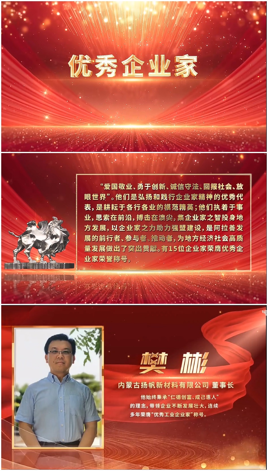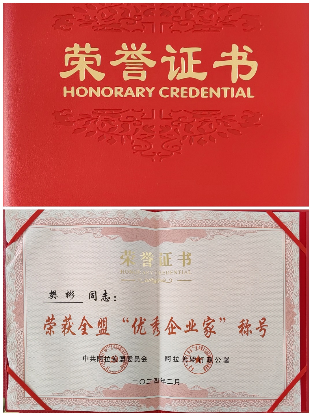 阿拉善盟委、行署對多年來建設阿拉善做出貢獻的優秀企業、企業家和工程技術人員進行表彰。樊彬董事長榮獲阿拉善盟“優秀企業家”榮譽稱號。