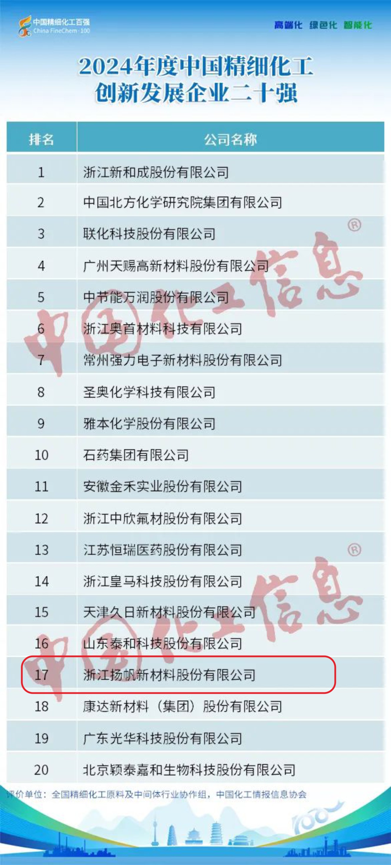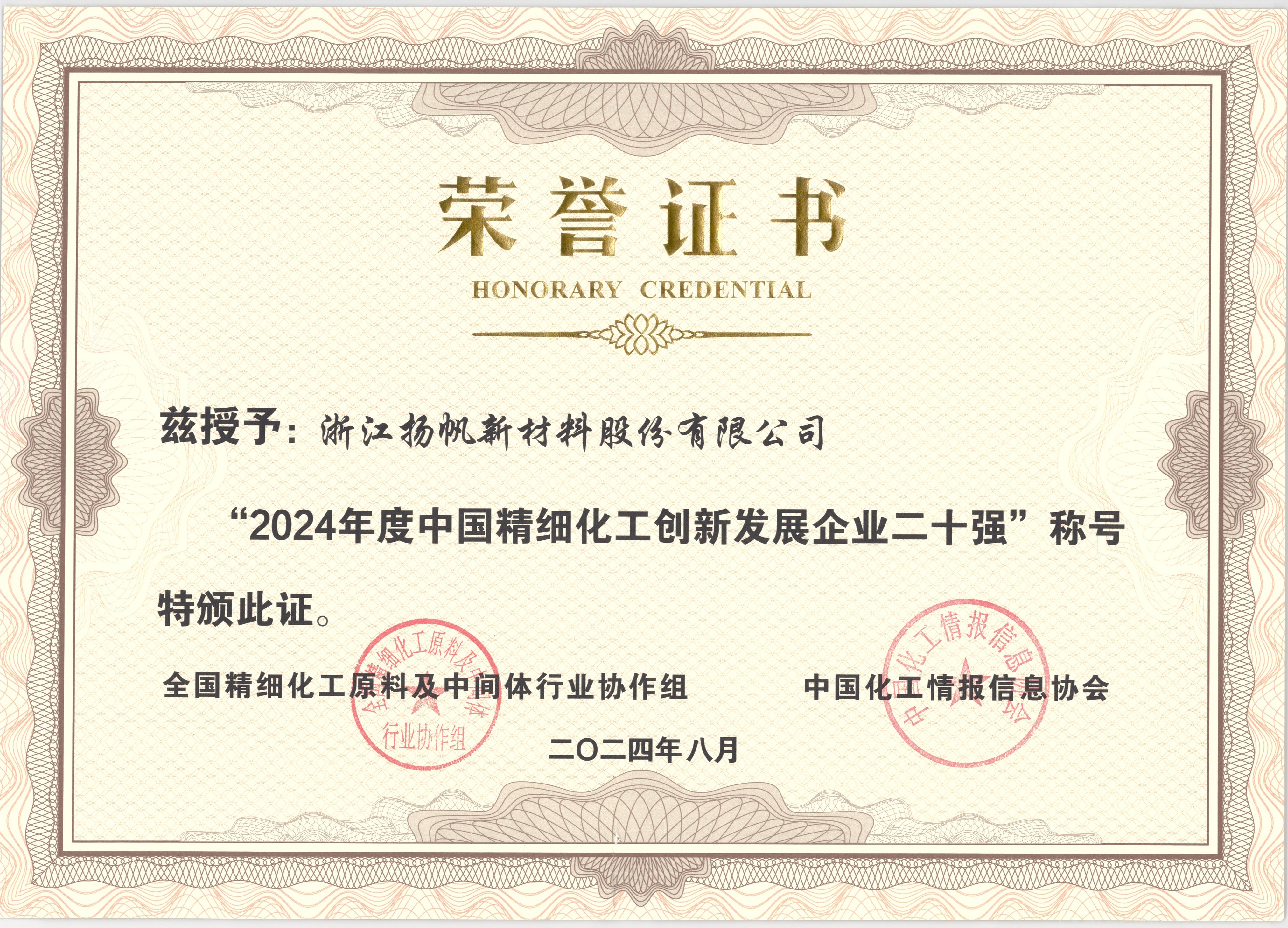 揚帆新材榮獲“2024年度中國精細化工百強”稱號